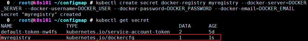 用来创建用户docker registry认证的Secret,直接使用kubectl create命令创建即可,如下: