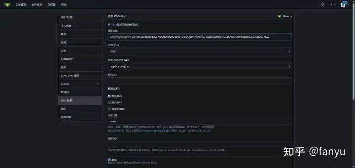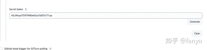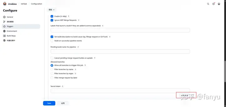 在任务配置->触发器->高级,点击Generate可生成token,在上述创建任务时已描述过