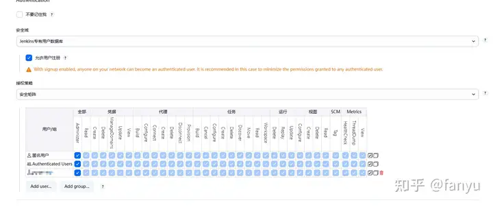点击Jenkins右上角设置按钮,选择全局安全配置,安全域选择【Jenkins专有用户数据库】,授权策略选择【安全矩阵】,点击保存
