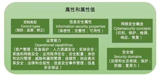 比如:控制类型属性是从事件的时间(发生之前、期间或之后)的角度来进行描述控制措施。信息安全属性是从信息安全涉及保护信息的特征来对安全控制措施进行描述。网络安全属性是从事件发生前、期间和之后网络安全活动的角度对安全控制措施进行描述。运营能力属性是从信息安全运行的控制的角度对安全控制措施进行描述。