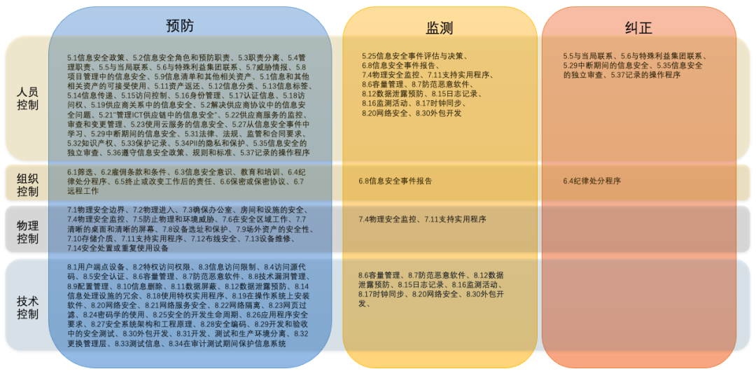 解读:2022版将控制措施分配到组织、人员、物理、技术的四个大主题,简单的主题使分类更加简单,这样方便了组织对安全控制点进行选择归类,可以通过归类的特定主题策略支持信息安全策略,以加强信息安全控制的实施。