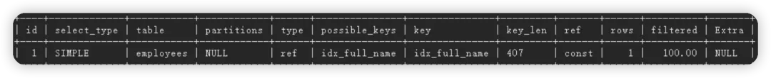 如上图所示,执行计划显示我们成功利用了 idx_full_name索引!