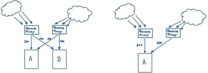 服务器过载最常见的原因是服务器过载。发生这种情况时,系统性能下降通常会影响系统的其他区域。如图 2 所示,在初始场景(左)中,来自两个反向代理的负载分布在集群 A 和 B 之间,因此集群 A 以每秒 1000 个请求的假设最大容量运行。