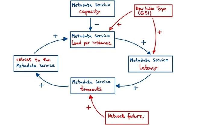 解释如下:箭头表示初始变量和后续变量之间的动态。例如,如果元数据服务的延迟增加,超时次数就会增加,所需的重试次数也会增加。如果系统中的影响是高度不平衡的,即正负的数量在很大程度上不相等,则存在一个加强循环。这意味着系统可能对级联故障很敏感。