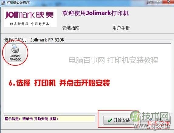 6、打开自动运行程序之后,之后就会弹出打印机安装程序界面了,选择打印机,然后点击“开始安装”如下图:
