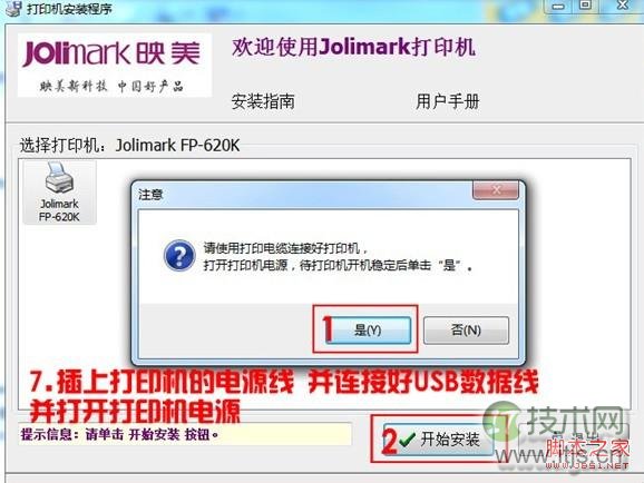 7、稍后会提示我们请连接好打印机电源以及数据线,由于我们开始已经连接好了,所以这里直接点“是”,如下图: