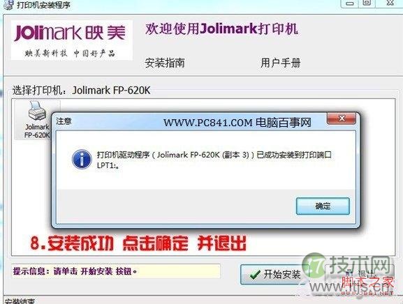 8、之后安装提示,一步步我们就可以成功完成打印机的安装了。如下图,安装成功后,我们点击确定即可成功完成,并退出了。