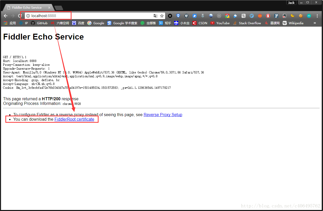 在电脑浏览器中输入地址:http://localhost:8888/,云服务器点击FiddlerRoot certificate,下载安全证书: