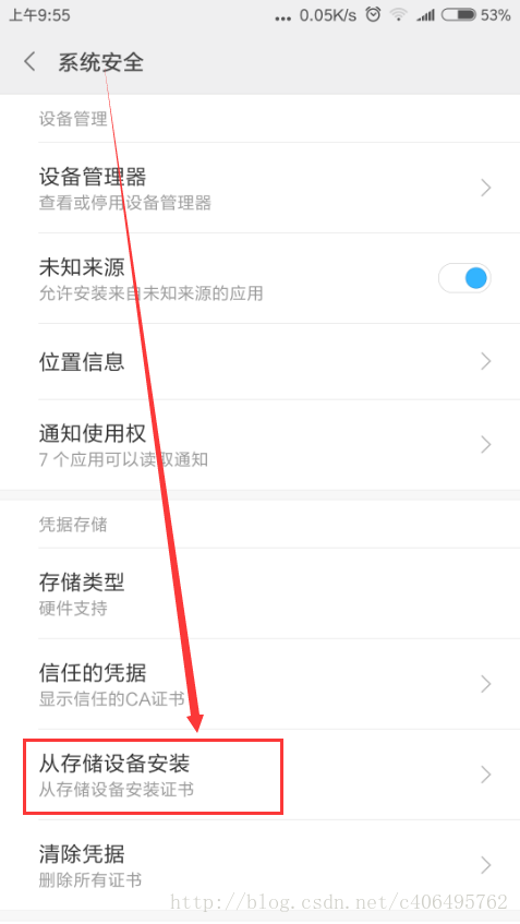 Android手机安装:把证书放入手机的内置或外置存储卡上,然后通过手机的"系统安全-》从存储设备安装"菜单安装证书。