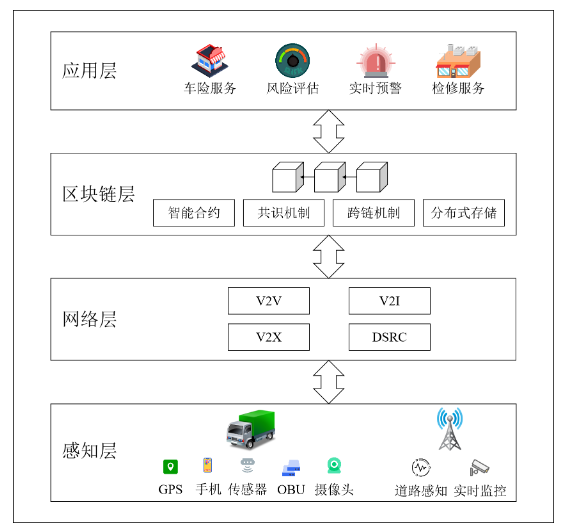 区块链在本质上是一种链式数据结构,它通过非对称密码算法、共识机制、分布式存储等方法,实现了链上存储数据很难被篡改和删除[12]。由于具备以上优良特点,区块链为车联网产业带来了技术革新,两者结合成为当前国内外科研机构、组织和公司研究的热点之一[13]。车联网区块链中各实体与技术构成了如图2所示的层级架构。各层级具体技术介绍如下: