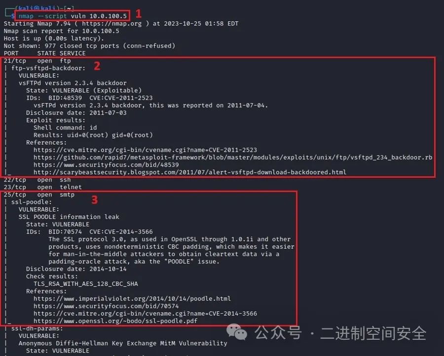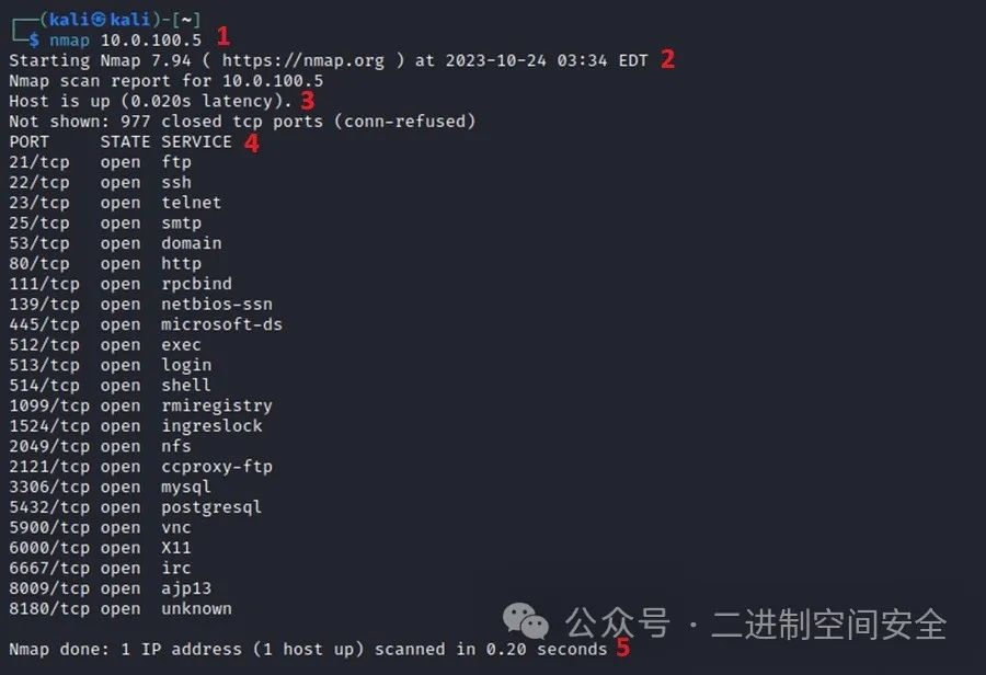 序号1: 用于运行漏洞扫描的命令行。接下来是默认的 Nmap 报告标头。