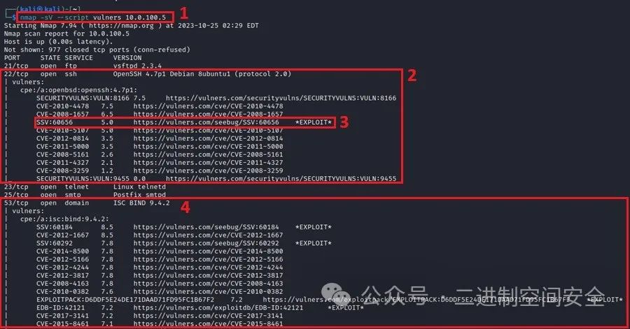序号3: 漏洞 ID 旁边的标志*EXPLOIT*表示该漏洞是可利用的,应该能够手动利用它或在线查找利用代码。