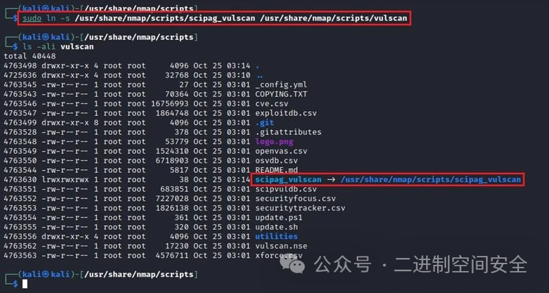 接下来,使用 Linux命令在文件和 Nmap vulscan 脚本ln之间创建符号链接。scipag_vulscan这将允许使用vulscanNmap 命令行上的选项。