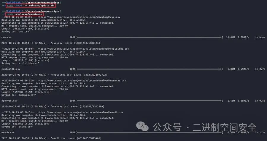 每当添加新的 NSE 脚本以在 Nmap 中使用时,需要运行 nmap 命令--script-updatedb来更新 Nmap 的数据库以识别新脚本。然而, 默认情况下,Nmap 中不包含 vulscan 脚本,这意味着无法使用该命令对其进行更新。相反,需要使用update.sh之前克隆的 GitHub 存储库附带的脚本来更新 Nmap 的数据库和 vulscan 从中提取的漏洞数据库。运行以下命令: