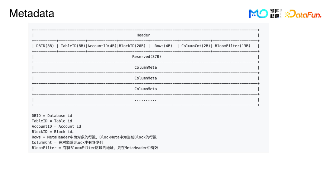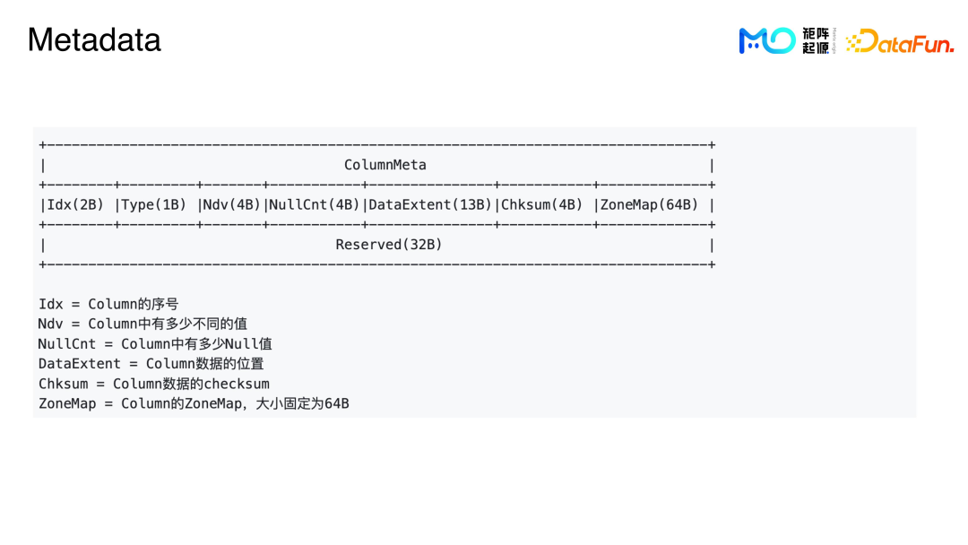 ColumnMeta 记录第几列,当前列是什么 type;NDV 即 column 中有多少不同的值;NullCnt 记录的是这一列中有多少 null 值;DataExtent 记录的是数据位置,也会记录压缩前和压缩后的数据大小;Chksum 是数据的 checksum;ZoneMap 是指这列的 MinMax 索引,然后通过 index 当前寻找的偏行地址就可以读这个数据。