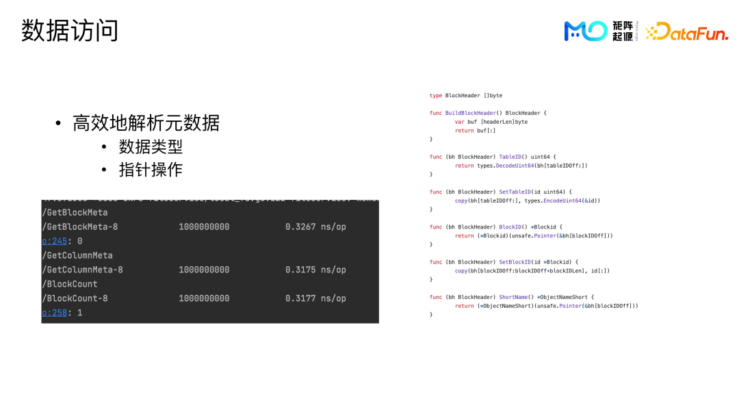 为了实现对元数据的高效解析,我们也做了很多尝试。比如采用 byte 的方式,放在内存里面也不需要序列化,直接去用就可以了。要去读哪些字段时,靠指针偏移即可完成。
