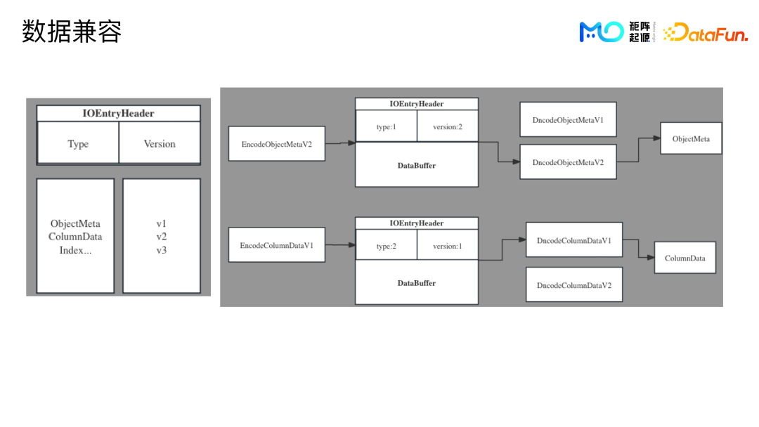 以上是结构图,IOEntryHeader 中记录着 Type 和 Version。Type 包括对象的 Meta,column data,还有 index 等等。用户写数据时,系统会注册一个 encode 函数,如果要写入对象的 Meta,对象 Meta 是版本 2,就会标记 type 为 type1,版本是 version2,后面就是要写入的 Meta的byte。