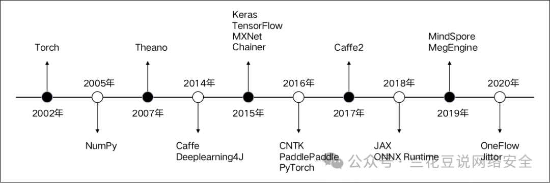 我们正处于AI时代浪潮中,不能重走明清海禁和闭关锁国之路,应当与世界同步,吸收和创新发展AI,这样才不至于在科技竞争中落败。b2b供应网网络安全也离不开AI,不管是AI自身面临的安全问题,还是利用AI去解决网络安全问题,作为网络安全从业者,都应当主动拥抱AI,思考AI和网络安全的关系,如何解决矛和盾的问题。下面主要介绍AI框架的发展历程、主流AI框架及AI框架的安全问题。