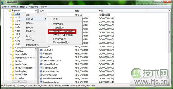 第二步、速切在“注册表编辑器”窗口,换工 依次找到“HKEY_CURRENT_USERSoftwareMicrosoftWindowsCurrentVersionExplorerAdvanced”。并右键点击“Advanced”项目,选择“新建”一个“DWORD(32-位)值(D)”。