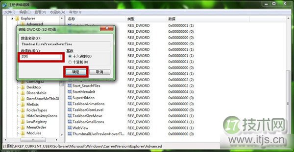 第四步、 我们双击打开“ThumbnailLivePreviewHoverTime”,并在“数值数据”输入“200”即2秒的服务器租用意思,再单击“确定”,重启电脑即可。