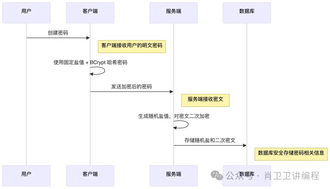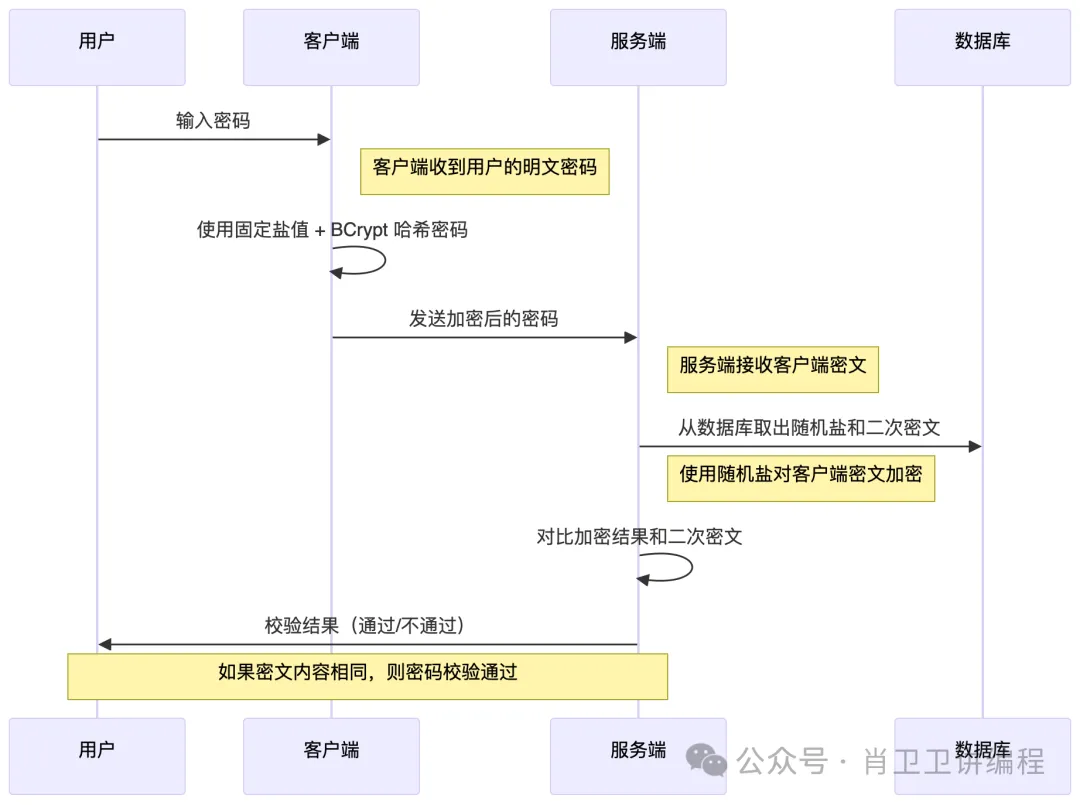 用户输入密码,客户端收到用户的明文密码客户端对密码使用固定盐值 + BCrypt 慢哈希进行加密后发给服务端服务端接收客户端密文,然后从数据库取出随机盐和二次密文服务端使用随机盐对客户端密文进行加密,然后和自身的二次密文进行对比密文内容相同,则表示密码校验通过相关文章