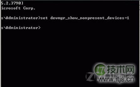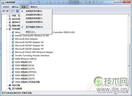 回车后打开设备管理器窗口,单击菜单“查看→显示隐藏的设备”,然后从设备列表中找到“网络适配器”项,找到并删除灰色的网卡图标即可。