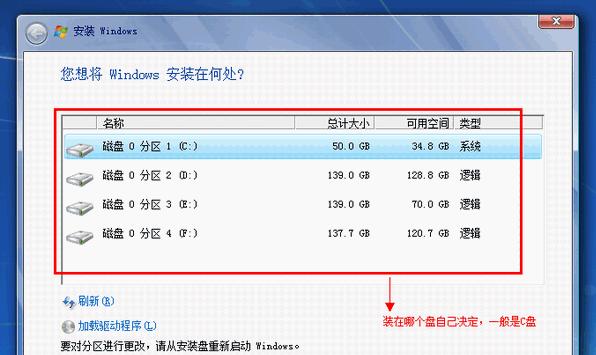 在安装界面中,您需要选择合适的磁盘分区,并进行格式化和分配空间的操作。