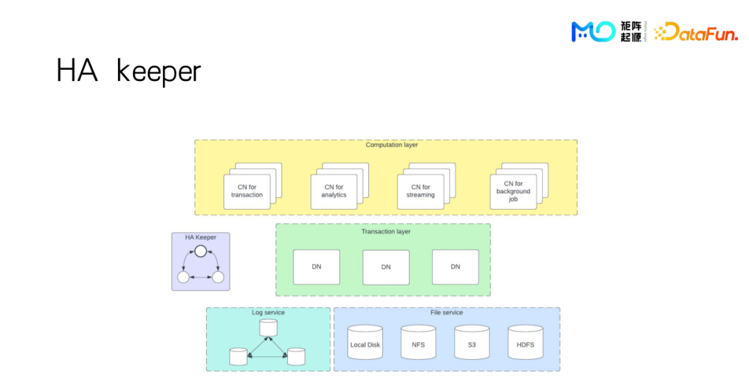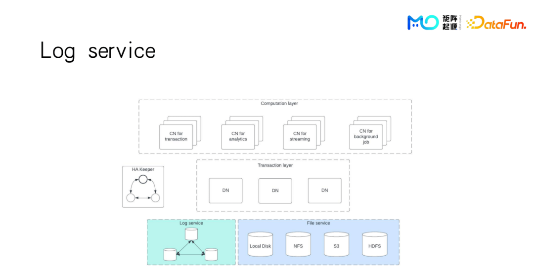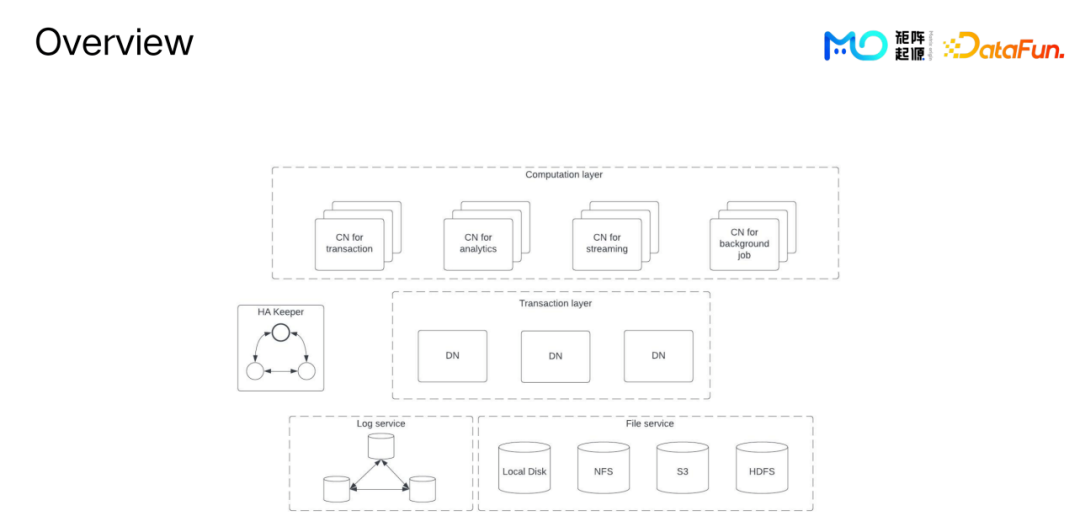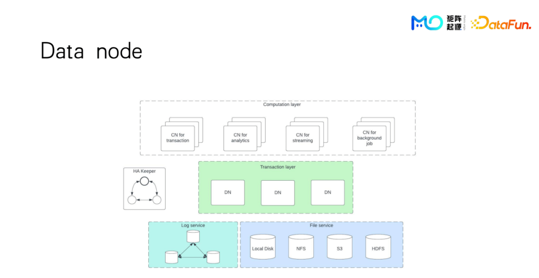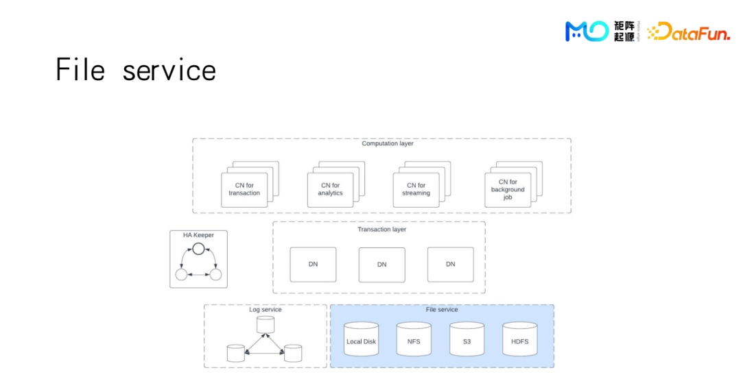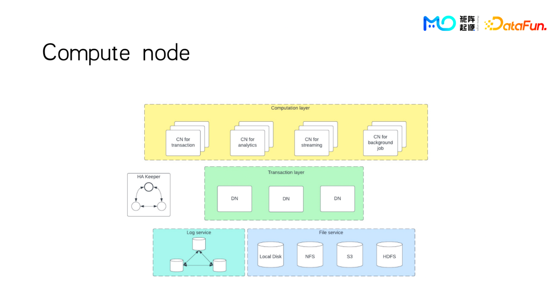 最上面是计算层,计算层里面的每一个单位是一个Compute Node (CN) 计算节点。在计算层下面是数据层,由Data Node (DN) 组成。再下面是File service,支持各种不同的文件系统。下面分别详细介绍一下每一部分。