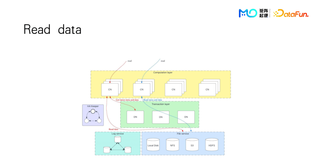 在这里DN节点只提供了元数据信息,基本上不会成为性能瓶颈。因为更多的数据是CN节点去直接向File service读取的,CN节点上面还会维护一个metadata cache。假设这个数据新鲜度还没有过期,甚至可以不需要访问DN,直接去File service下面拉取数据。
