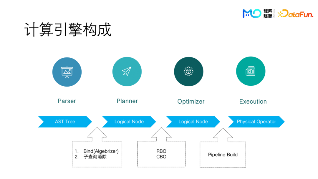 第一个是parser:把一个SQL语句解析成一个AST树。第二个是planner:把AST树转化成一个逻辑计划。第三个是optimizer:把逻辑计划通过各种优化器规则或者是通过一些基于代价估算的方式转化成更好的逻辑计划。最后是execution:把具体的逻辑计划转化成可执行的pipeline,然后去具体的CPU上面执行。语法解析器(Parser)