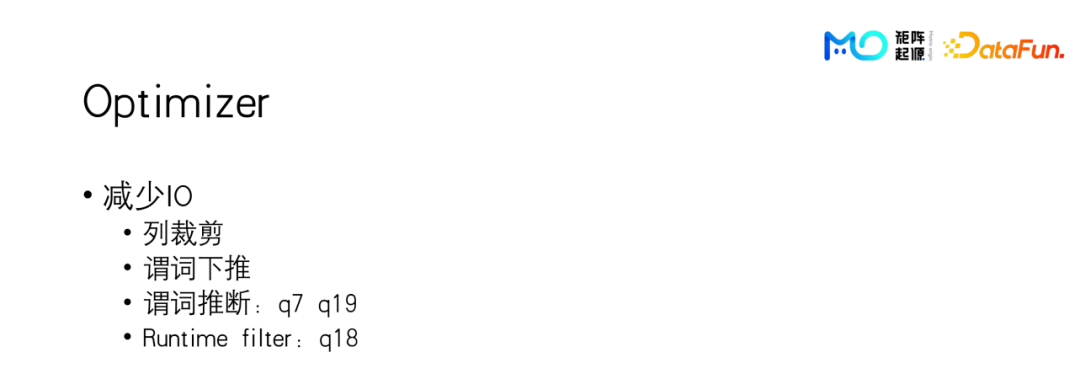 列裁剪,读一张表,有很多列,但我实际上只用到其中一列,那么其它列是不用读取的。谓词下推,就是把一些过滤条件直接推到读取数据这一部分,这样可以尽量少的读取数据。谓词推断,主要会影响TPC-H里面的Q7和Q19,在后面会再举例详细介绍。Runtime filter ,比如大表跟小表做join操作,在小表构建完hash表之后,可能hash表的计数非常小,这样我们可以直接通过hash表里面不同的词去大表里面通过runtime或者元数据信息进行过滤,这样在运行时就大大减少了需要读取的大表的block数量。