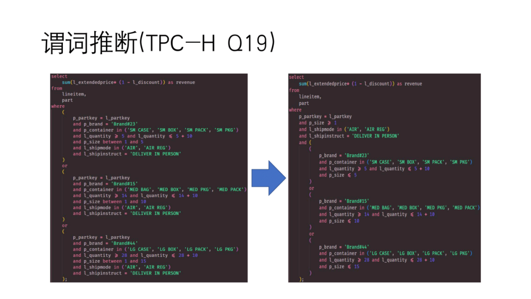 谓词下推是已经确定显式的可以下推的一个位置。但谓词推断可能是需要做一些逻辑上的变化之后,才能得到一些新的谓词,这些新的谓词才可以下推下去。比如TPC-H Q19的过滤条件是三个很长的谓词用or连接起来,通过观察实际上这三个or里面有很多共同的部分,可以把共同的部分提取出来,变成右图的样子。可以观察到,首先part这张表上面有一个可以下推的谓词,lineitem这张表上面也有两个可以下推的谓词。这样可以先把这两个谓词下推到每个表的table scan上面去。然后还多出来一个在part和lineitem上面用主键做连接的谓词。如果原来不对这个执行计划做优化直接去执行,可能会先做一个笛卡尔积,再去做过滤操作,这样的效率会非常低。现在我们可以把它变成一个join操作。