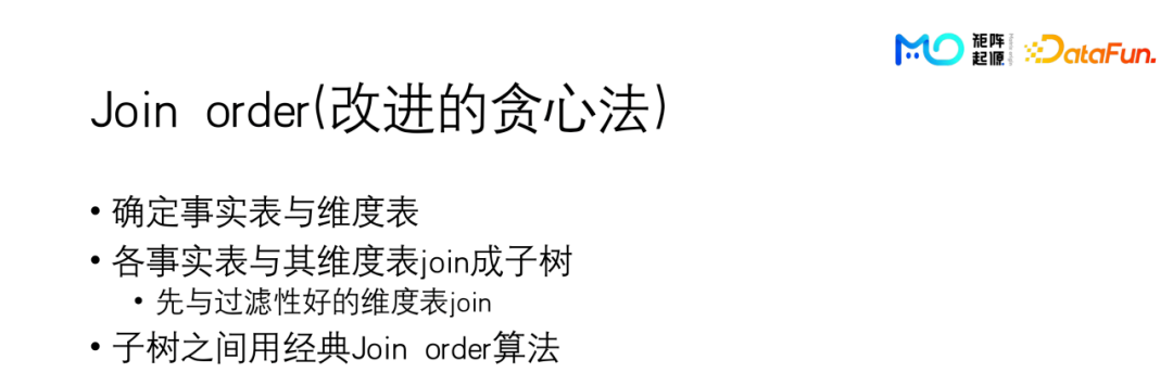 第一步是确定事实表和维度表,因为一般的OLAP查询的数据通常会把表分成事实表和维度表,之间用维度表的主键做join。因此拿到一个查询之后,我们可以把事实表和维度表给找出来。下一步事实表先与其维度表join成子树,因为事实表维度表之间始终是通过维度表的主键去做join。做这样的join的结果的函数始终是不大于他本来输入的函数,所以做这么一个join并不会造成很多OLAP开销,不会造成数据膨胀。在做事实表维度表join的过程中,我们会考虑事实表先与过滤性好的维度表做join。就优化器而言,越早减少数据量是越好的。最后一步是在子树之间,像TPC DS的表,会有多个维度表,维度表互相之间都不是以主键来做join。那么在子树之间,我们再使用经典的join order的算法,比如动态规划等等。这样我们把Join order的算法从之前只能10表以下做动态规划,扩展到10个事实表之下都可以使用动态规划来做。