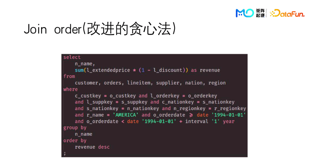 join order的join定序。通常使用TPC-H做OLAP 的benchmark,join order会影响很多不同的查询,如果join order做的不好,这些查询都可能会以数量级的变慢。
