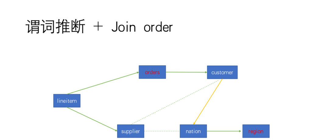 最后实际生成的最优的join顺序是从region开始,先跟nation表join,再跟customer表join,再跟orders 表join,再和lineitem表 join,最后跟supplier表 join。这是我们新推断出来的条件。那么为什么是走这么一个路线,而不是先把上面这一条路join完成后再join下面这边的表,是因为我们考虑到orders,region这两张表都有过滤条件,放在一起过滤效果会更好。这样会让lineitem这张表的行数减少的速率更快。