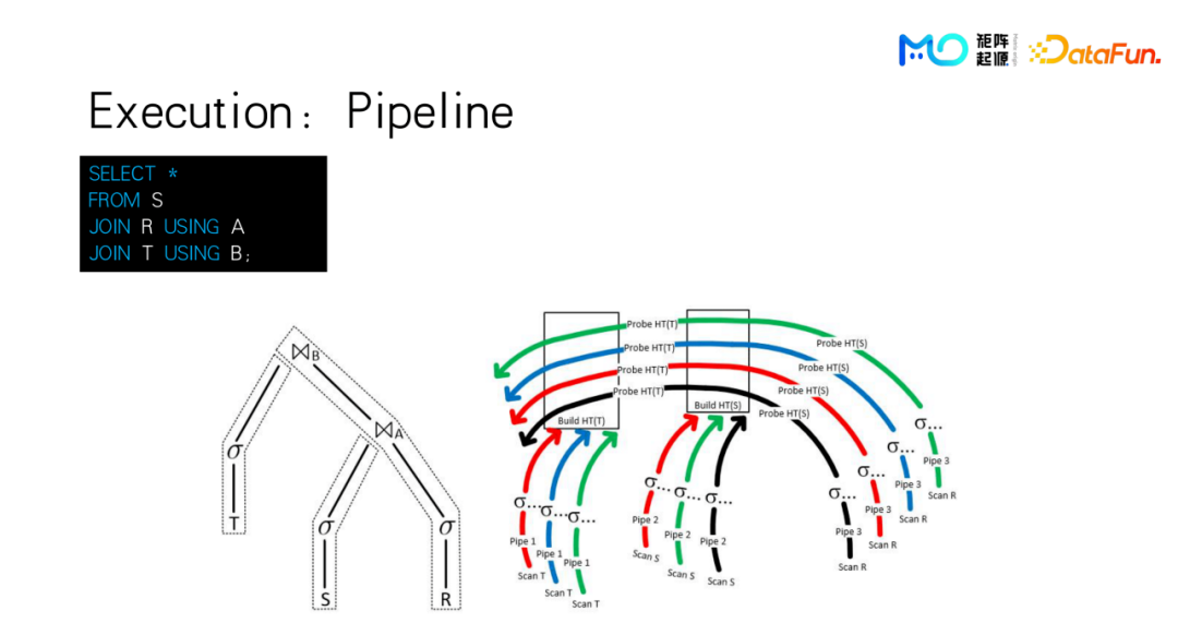 右图还包括了数据并行的信息,比如S表可能会使用go语言里的三个协程并行的去读数据,再做合并操作,合并完之后构建hash表,T表也是用三个协程去并行的读,读完之后,然后送到这里的构建hash表。R表因为比较大,pipeline会展开出更多的实际pipeline出来。我们可以看到就是R表这个pipeline是不会被阻断的,通过hash operator之后,会继续进到下一个join节点。