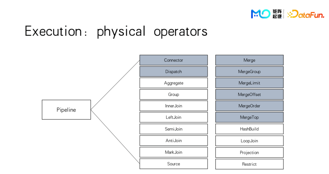 如上图,我们的pipeline提供了这些算子,比较典型的有聚合、分组和各种join操作。这里把merge和connector、dispatch的颜色标识成不一样,因为它们和其它operator的区别是其它算子都是只能在一个pipeline的中间,接受的数据是从上一个算子传过来,发送的数据就直接发送给下一个算子去做后续的计算。而标成灰色的这一部分是在一个pipeline的数据的source或者sink,即入口或者出口的地方,比如merge它会去其他的pipeline去接收数据,把所有pipeline的数据合并成一个,返回给用户。同理group by或者order by算子,也会执行merge操作。