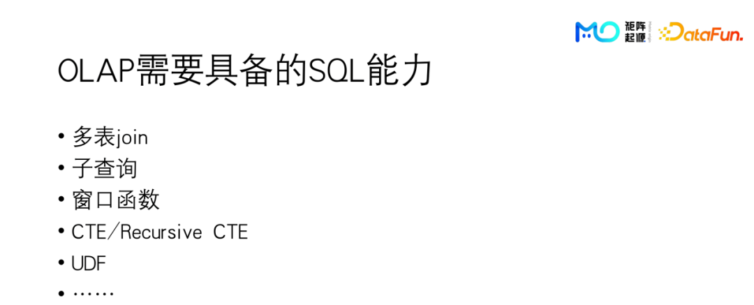 对于OLAP系统,从语义上来说通常跟SQL本身没什么关系。但是OLAP的分析性查询会是比较复杂的计算任务,有一些SQL能力是必须具备的,比如多表join、子查询、窗口函数,还有CTE 和Recursive CTE,以及用户自定义函数等。MatrixOne目前已经具备这些能力。