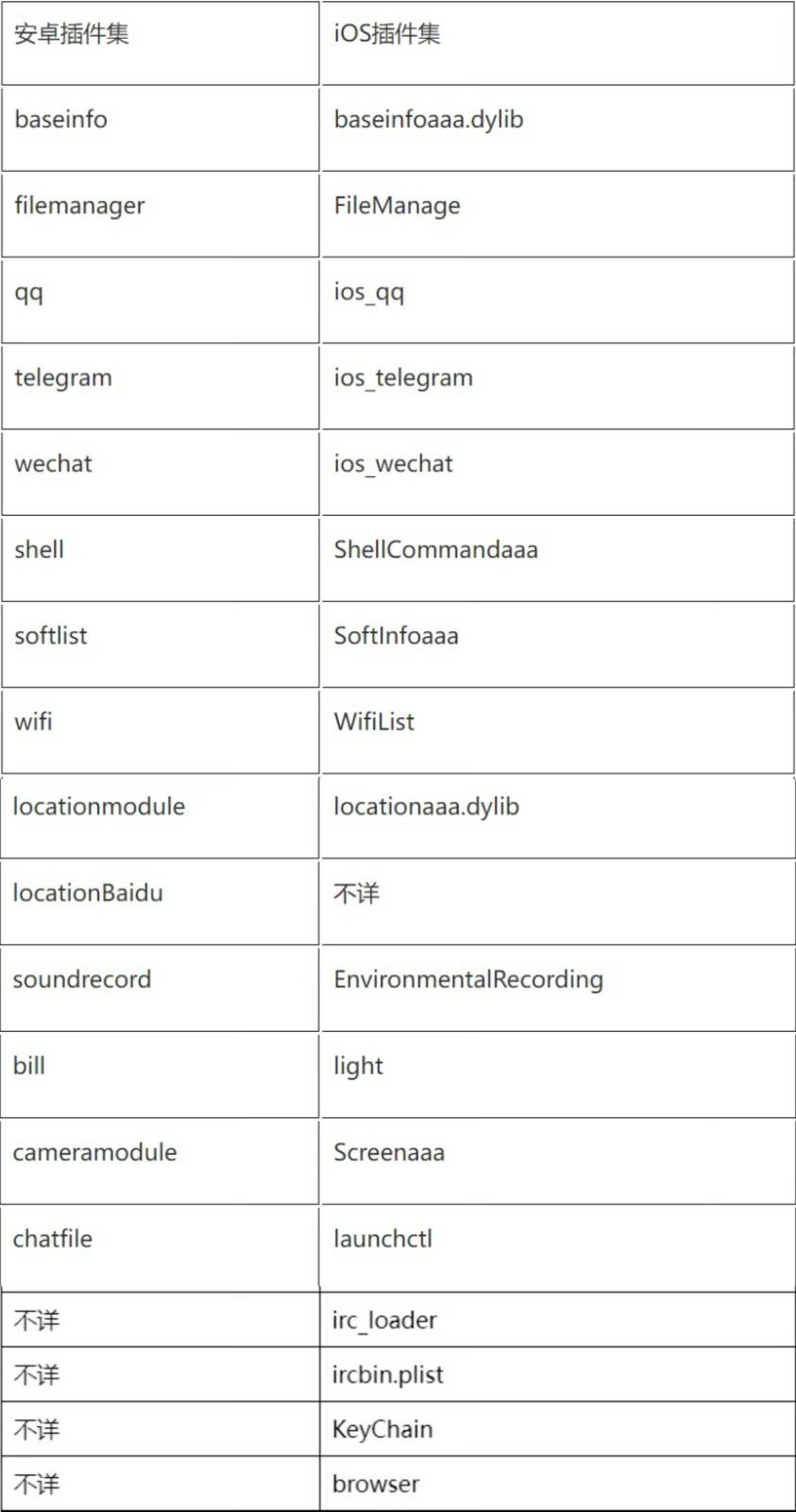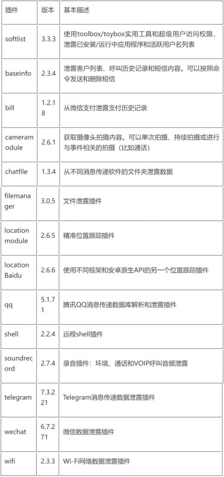 该恶意软件已添加了多个插件,包括soft list(软列表)、baseinfo(基础信息)、bill(账单)、cameramodule(摄像头模块)、chatfile(聊天文件)、filemanager(文件管理器)、locationmodule(位置模块)、locationBaidu(位置百度)、qq、shell、soundrecord(录音)、telegram、wechat(微信)和wifi。