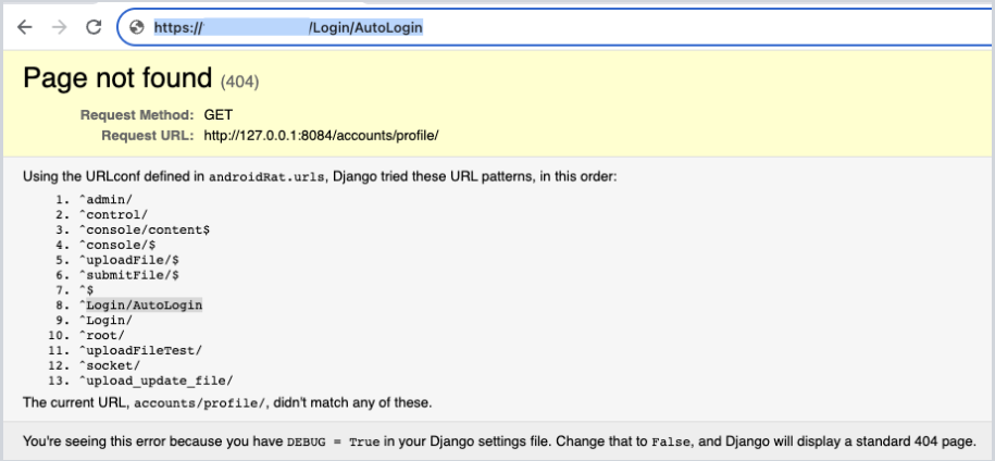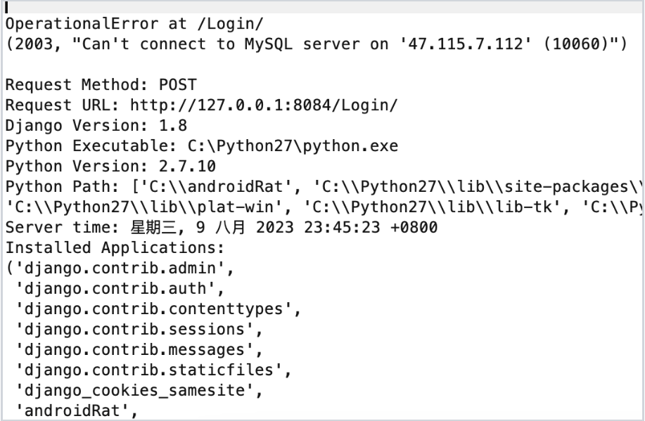 由于面板在处于调试模式的Django中,它暴露了一些内部信息,比如一个内部文件夹(整个前端和后端文件存储在服务器中),以及另一个IP地址47.115.7[.]112:
