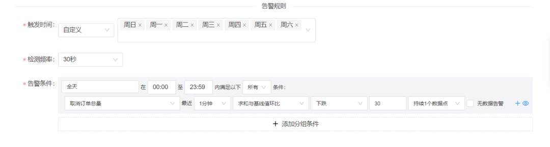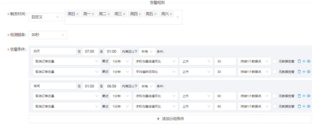 如果在这个时候,我们为了适应夜间的大波动,而将30%的阈值拉长,修改到50%甚至80%,这样的话确实在一定程度上降低了噪音的产生;但在另一方面,我们的告警发现率可能会大大降低。假如出现线上故障的时候,流量波动下小于我们设置的阈值范围,那么整个配置都没有意义。在这个时候,我们就开始构思区分白天和夜间,跑两套规则,保证噪音相对较低的同时,也能反映出线上的问题,于是取消订单的规则就变成了如下所示:
