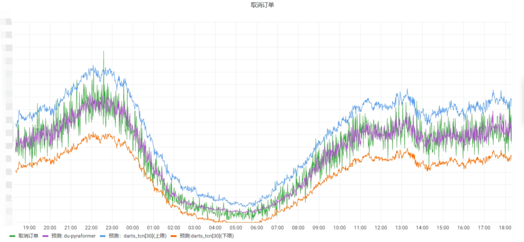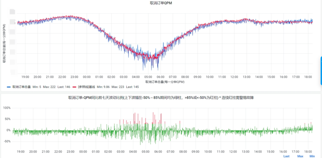 如上图所示,当我们实时流量与线上真实流量偏差较大的时候,我们可能让基线尽可能的靠近线上实时流量,从而更好的评估线上流量水平,不至于让我们的告警失灵,产生过多的噪音;针对取消订单场景,我们也做了如下调整:
