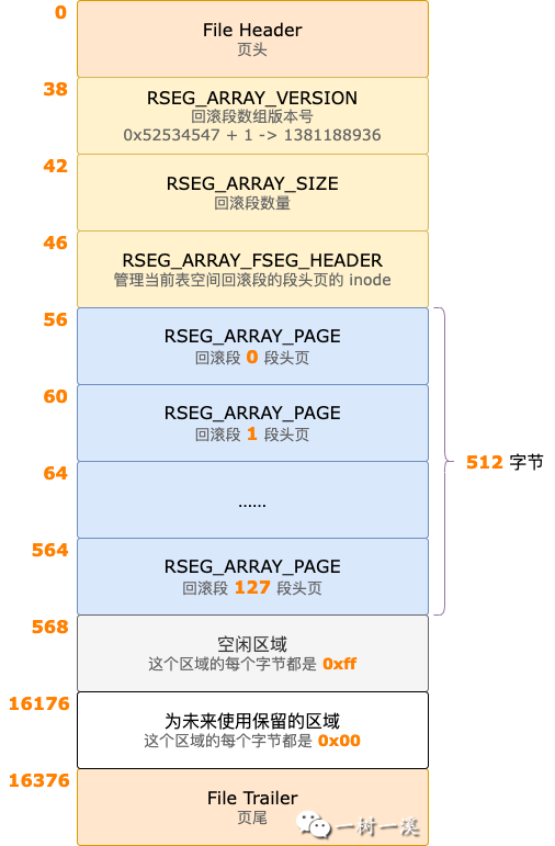 每个 undo 表空间中,page_no = 3 的页专门用于保存回滚段的段头页的页号,这个页的类型是 FIL_PAGE_TYPE_RSEG_ARRAY,从 Offset 56 开始,保存着 128 个回滚段的段头页的页号,如下图所示: