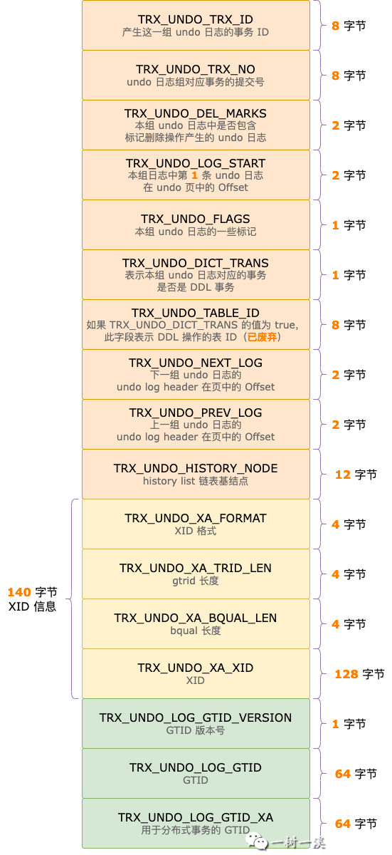 (1)什么是 undo log header?一个事务产生的 undo 日志属于一个日志组,undo log header 是日志组的头信息,各字段如下图所示: