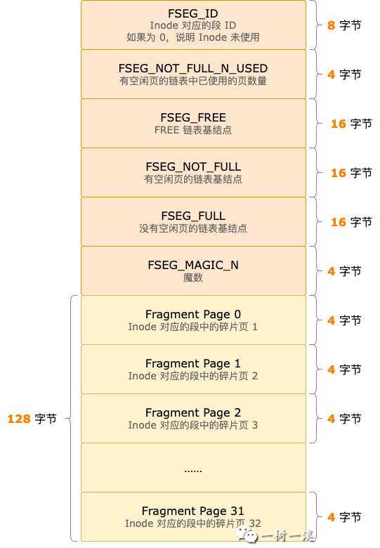 FSEG_FREE,这个链表的每个 extent 中,所有页都没有被使用,全都是空闲页。FSEG_NOT_FULL,这个链表的每个 extent 中,都有一部分页已被使用,另一部分页是空闲页。FSEG_FULL,这个链表的每个 extent 中,所有页都已经被使用,没有空闲页。根据页的分配规则,inode 关联的段每分配一个页,既有可能从 32 个 fragment page slot 中找一个空闲页,也有可能从 FSEG_FREE、FSEG_NOT_FULL 中找一个空闲页。