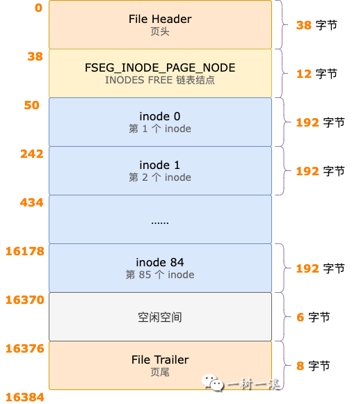 (2)分配 inodeundo 表空间中,有专门的 inode 页用于存放 inode,每个 inode 占用 192 字节,16K 的 inode 页最多能够存放 85 个 inode,如下图所示: