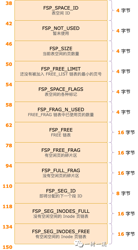 FSP_SEG_INODES_FULL,这个链表中的所有 inode 页都存放了 85 个 inode,不能再存入新的 inode。FSP_SEG_INODES_FREE,这个链表中的所有 inode 页都还有空闲空间可以存入新的 inode。File Space Header 中的各字段如下图所示: