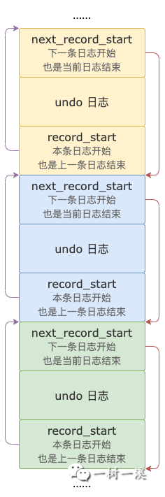 每一条 undo 日志中,第一个字段是 next_record_start,占用 2 字节,保存着下一条 undo 日志的第一个字节在 undo 页中的 Offset。