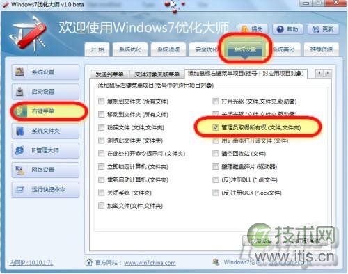 这里说的优化工具有很多种,一般支持WindowsVista的WordPress模板优化工具,都能用来优化Windows 7,比如Vista优化大师(进入下载),Vista总管(进入 下载)等,当然那些专门设计给Windows 7的优化软件也可以达到一样的效果,比如Windows 7优化大师(进入下载)、Windows 7总管等等。这些工具中的系统设置中,右键设置都有 添加获得管理员权限的功能,这里就不详细说明了,大家自己找一下即可。