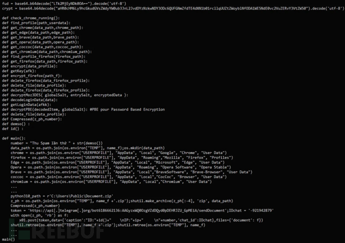 该恶意软件会将受害者网络浏览器上存储的所有 cookie 和登录数据收集到一个名为 "Document.zip "的 ZIP 压缩包中,然后通过 Telegram 或 Discord 僵尸 API 将窃取的数据信息发送给网络攻击者。